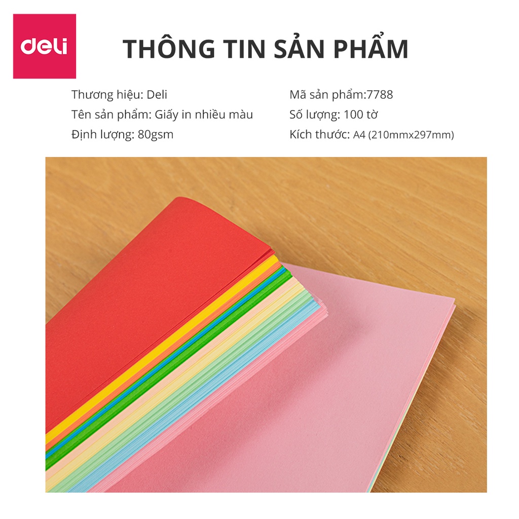 Giới thiệu Giấy in nhiều màu khổ A4 Deli - Định lượng 80gsm - 100 trang/tệp - 2 tông màu pastel / sặc sỡ - 7788