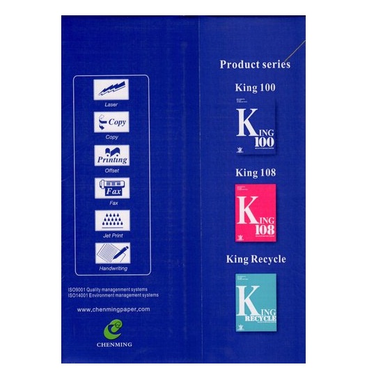 KING 100 là sản phẩm giấy in, giấy photocopy chất lượng cao ứng dụng công nghệ Colorlok, Khách hàng sẽ không phải lo đến các vấn đề như nhòe mực hay hiện tượng thấm ngược.- Với mức giá thành phải chăng, màu sắc in trên giấy rõ nét, đây là một trong những loại giấy in mới xuất hiện nhưng lại bán chạy trên thị trường hiện nay.
