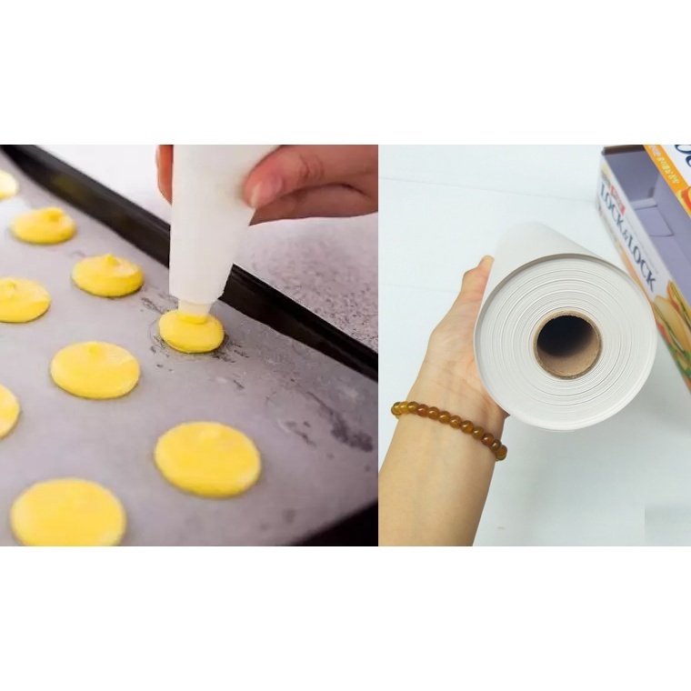 - Giấy có tác dụng chống dính khi dùng trong lò nướng, lò vi sóng, lót đáy khuôn, thành khuôn, bảo quản đồ ăn. Mỗi cuộn giấy đi kèm với hộp bao ngoài và phần răng cưa giúp cắt giấy dễ dàng