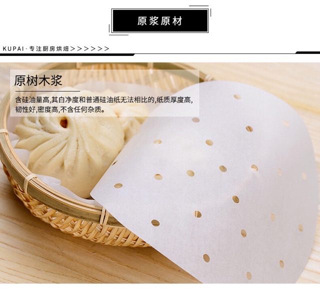 Giấy nến đục lỗ có thể dùng làm lót các đồ hấp (bánh bao, há cảo, disum) hoặc dành cho nồi chiên không dầu.Loại nến bóng 2 mặt, chống dính rất tốt, không cháy khi nhiệt cao.