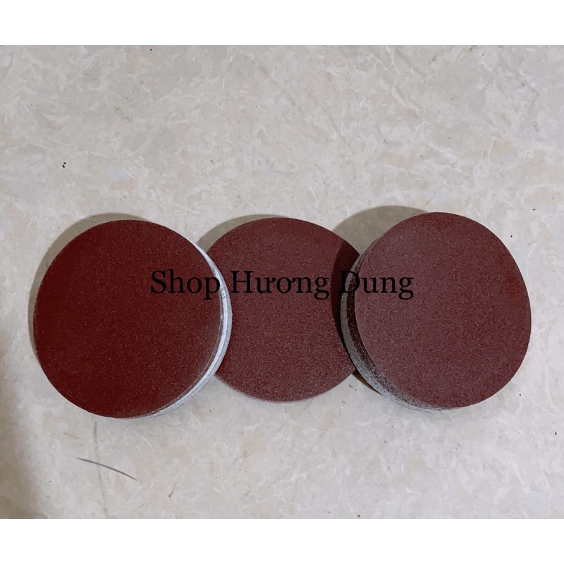 - Giấy nhám tròn 1 mặt nhám , 1 mặt có tơ dính dùng để dán lên phớt nhựa tròn gắn máy mài có nhiều kích cỡ