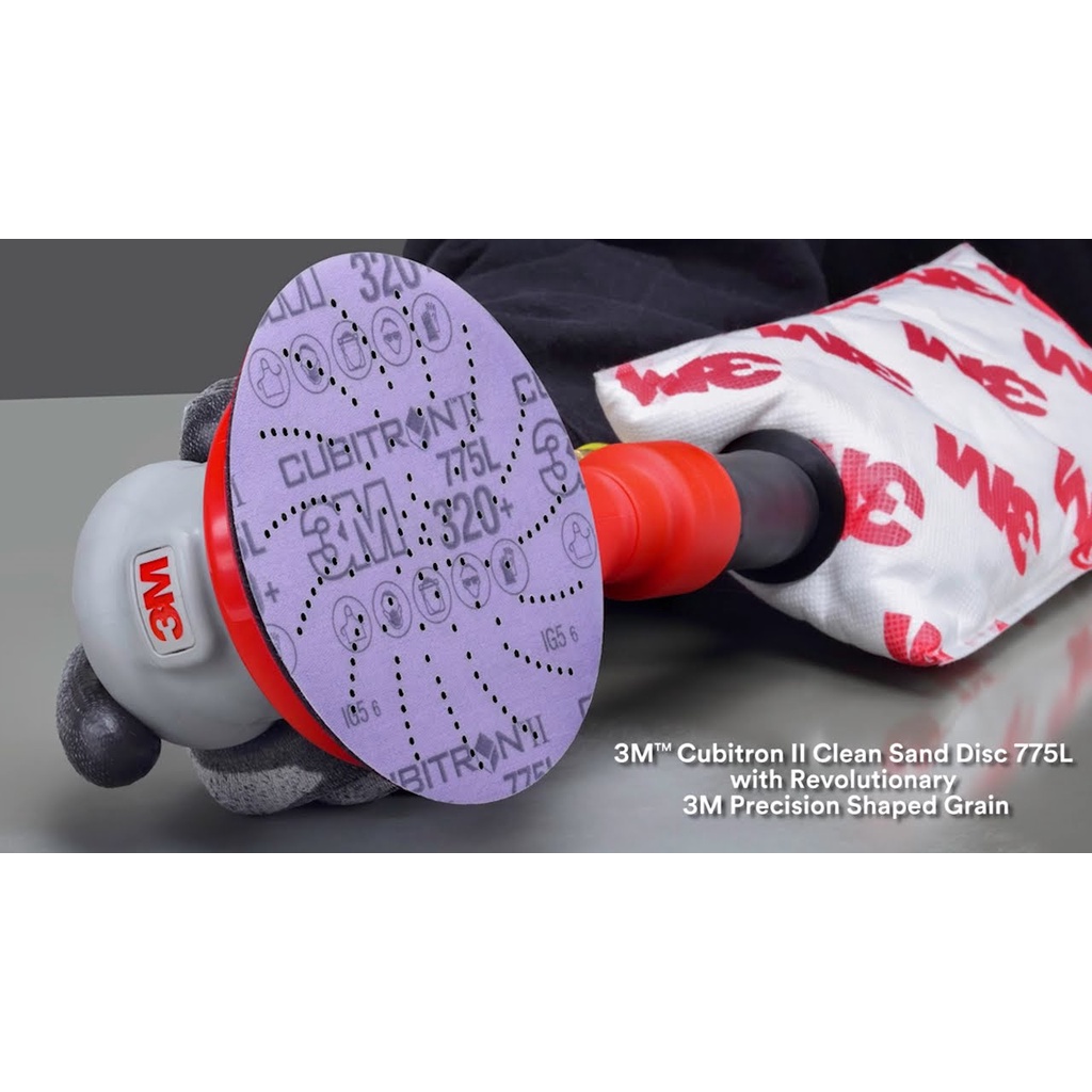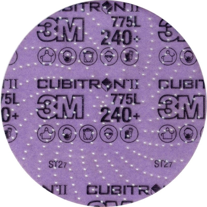 Đĩa phim nhám 3M ™ Cubitron ™ II Hookit ™ 775L có tính năng Hạt gốm định hình chính xác 3M, một tiến bộ mang tính cách mạng trong công nghệ mài mòn. Khoáng chất gốm hình tam giác được thiết kế để cắt xuyên qua bề mặt, thay vì đục hoặc "cày" như vật liệu mài thông thường, dẫn đến đĩa có thể cắt nhanh gấp 2 lần và kéo dài tới 6 lần như vật liệu mài thông thường.