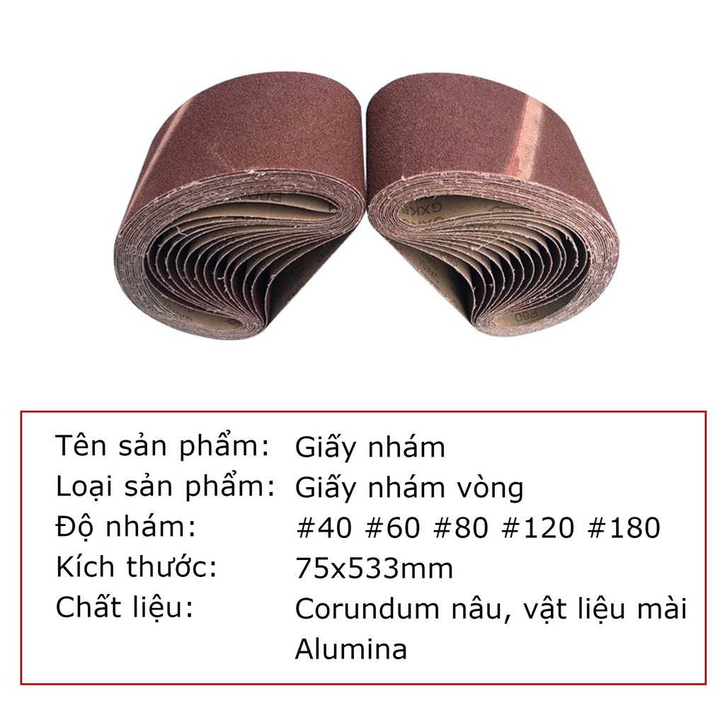 Giấy nhám vòng 75x533 mm đánh bóng gỗ, kim loại nhiều độ nhám:- Tên sản phẩm: giấy nhám vòng