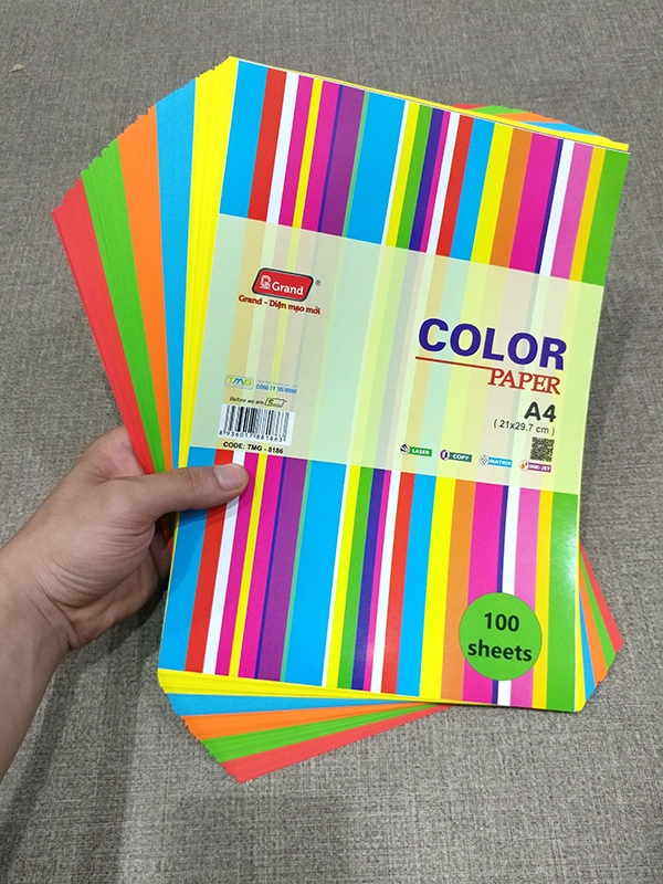 Giấy Photo A4 Màu Cao Cấp Grand (Trộn 5 Màu) gồm 100 tờ khổ A4 Với hai mặt giấy láng mịn phù hợp với tất cả các loại máy in phun, máy in Laser, máy Fax laser, máy Photocopy, đặc biệt hơn là có thể in đảo 2 mặt mà không lo kẹt giấy cho phép in ra những văn bản và hình ảnh tuyệt đẹp với độ rõ nét cực cao. Đồng thời loại giấy này không bụi, giúp bảo vệ sức khỏe người dùng đặc biệt là mắt và kéo dài tuổi thọ cho máy. Khổ giấy A4 chuẩn, chuyên dụng cho công việc in, photo,... ngoài ra với màu đẹp nổi bật có thể dùng profile, trang trí, thiệp, hay cắt dán thủ công cho các bé rất thích hợp.