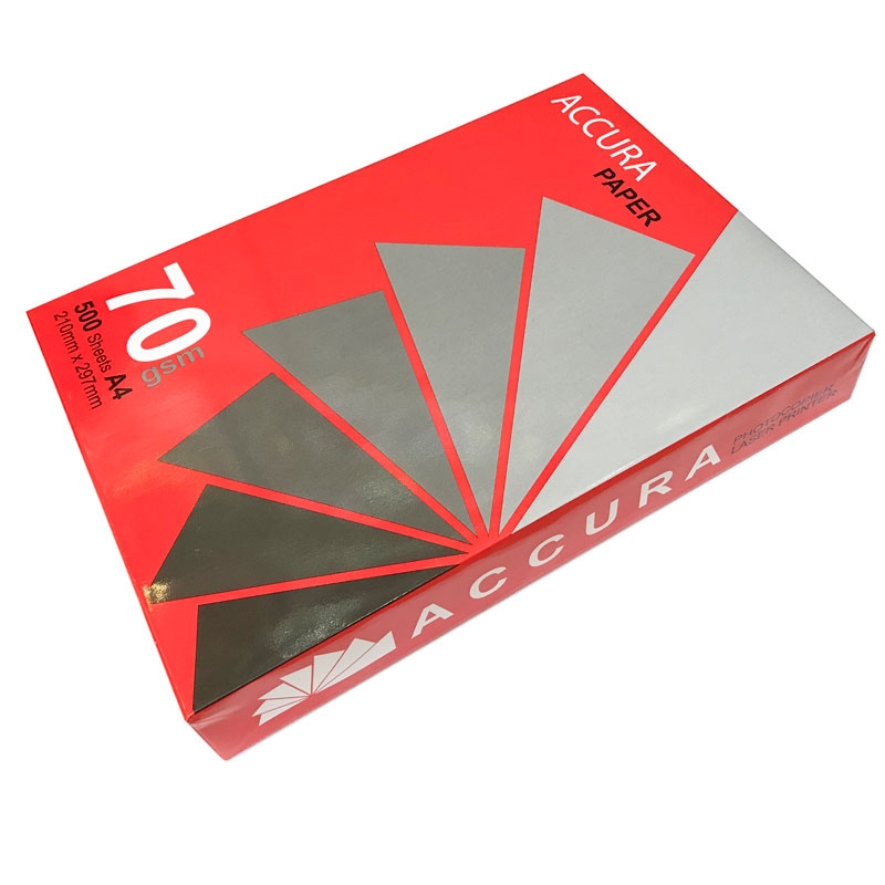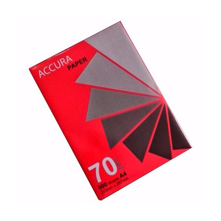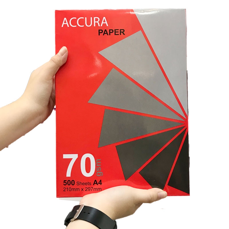 Giấy Photo Accura A4/70gsm Mặt giấy láng và rất mịn in hai mặt mà không bị nhăn và lem mực. Đặc biệt thích hợp cho máy in Laser và máy photocopy công suất lớn. Khổ giấy chuẩn tuyệt đối chính xác, đảm bảo không bị kẹt giấy khi in. Giấy không bụi, giúp đảm bảo sức khỏe người sử dụng và kéo dài tuổi thọ của máy Khổ giấy: A4 70gsm, đóng 500 tờ/ream Độ trắng cao, hình ảnh in đẹp với độ tương phản và rõ nét cao.