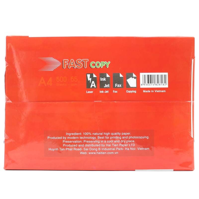 Giấy Photo Fastcopy A4 65gsm - Hải Tiến (500 Tờ) Giấy in, photocopy Fastcopy với độ dày vừa phải, định lượng đảm bảo 65gsm phù hợp cho tất cả các tác vụ văn phòng, photocopy, in ấn. Các ream giấy được đóng đủ 500 tờ, đúng kích cỡ A4 và không có hiện tượng hụt giấy; được đóng gói chắc chắn đảm bảo giấy không bị ẩm khi chưa sử dụng Giấy in, photocopy Fastcopy phù hợp để sử dụng cho tất cả các loại máy in phổ thông hiện nay và máy photocopy đang được sử dụng. Giấy có tỉ lệ kẹt giấy rất thấp, ít bụi giấy nên có thể kéo dài tuổi thọ sử dụng của máy in và máy photocopy.