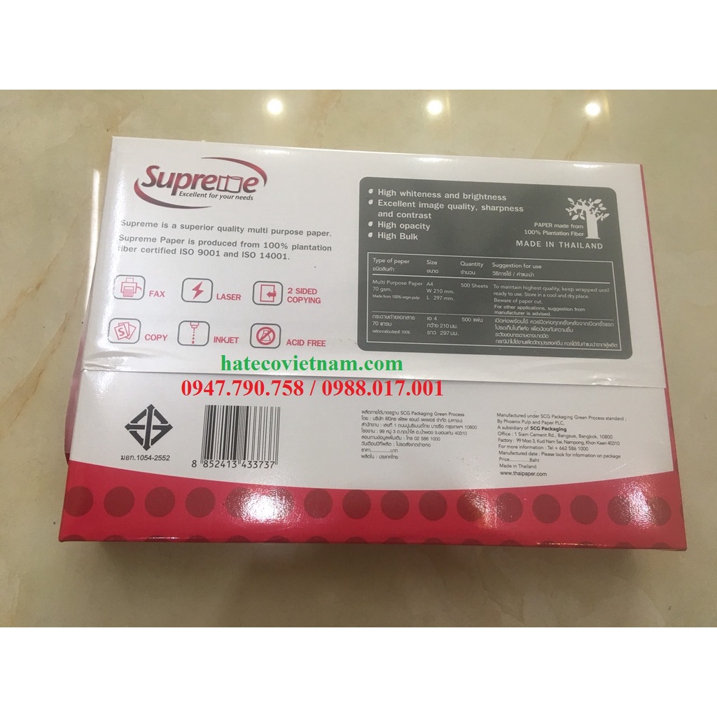 - Giấy Supreme A4 70gsm là loại giấy in cao cấp, trắng, đẹp, thích hợp với tất cả các loại máy in.