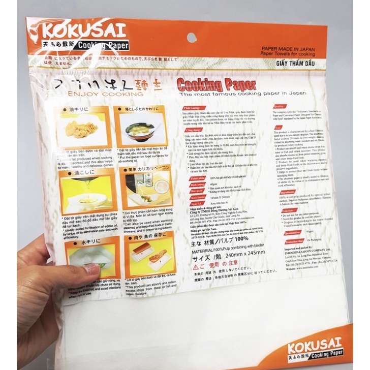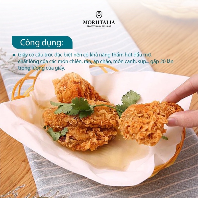 + Giấy có cấu trúc đặc biệt nên có khả năng thấm hút dầu mỡ, chất lỏng của các món chiên, rán, áp chảo, món canh, súp... gấp 20 lần trọng lượng của giấy