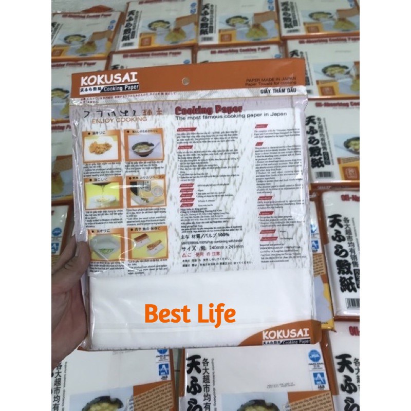 Giấy thấm dầu:Giấy thấm dầu thực phẩm Kokusai dùng để thấm hút các loại dầu, mỡ khi chiên, rán thực phẩm giúp giảm chất béo trong món ăn nên ăn sẽ ngon miệng hơn, bảo quản thực phẩm được lâu hơn và không làm ảnh hưởng tới sức khỏe.