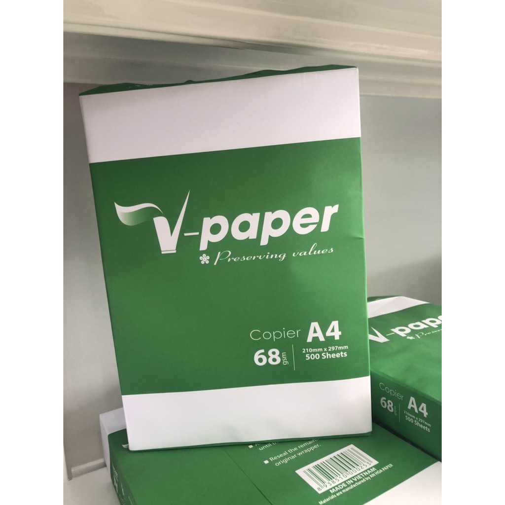 Giấy V-Paper A4 68gsm ( 500 tờ )Giấy V-Paper A4 68gsm: Sản phẩm Giấy V-Paper, bao gói ngoài màu xanh lá cây là sản phẩm giấy in, photocopy đang được ưa chuộng và tin dùng trên thị trường Việt Nam. Giấy có bề mặt trắng đẹp, láng mịn, độ sắc nét cao. Khi in hoặc photocopy 02 mặt không bị kẹt giấy và cho ra văn bản, hình ảnh đẹp. Thích hợp với tất cả các loại máy in phun, máy in laser, máy fax laser, máy photocopy. Sản phẩm được tin dùng không chỉ bởi chất lượng giấy tốt, phù hợp với hầu hết các máy in, photocopy mà còn bởi giá thành tiết kiệm cho các doanh nghiệp và cửa hàng photocopy.