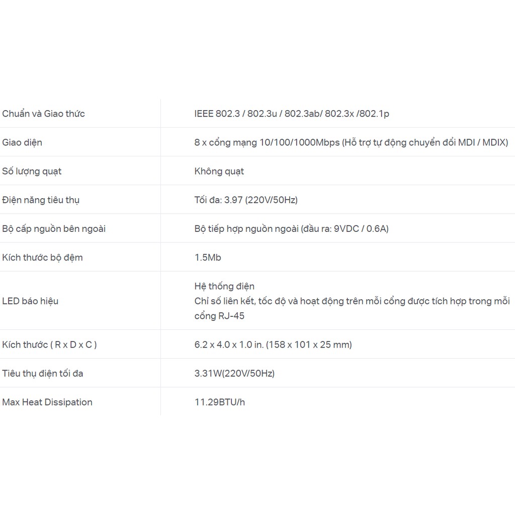 8 cổng 10/100/1000Mbps RJ45 Giegabit tính năng tự động đàm phán, hỗ trợ Auto MDI/MDIX.Điều khiển lưu lượng chuẩn IEEE 802.3x cung cấp sự truyền dữ liệu đáng tin cậy.