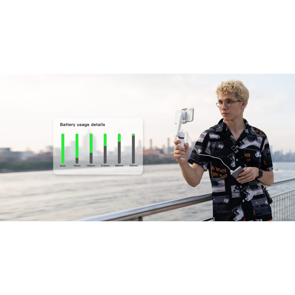 Về thời lượng pin, gimbal SMOOTH XS cho thời gian hoạt động lên đến 5.5 giờ, cùng với hỗ trợ sạc dự phòng, người dùng có thể thoải mái sử dụng mà không lo lắng về tình trạng pin của gimbal.