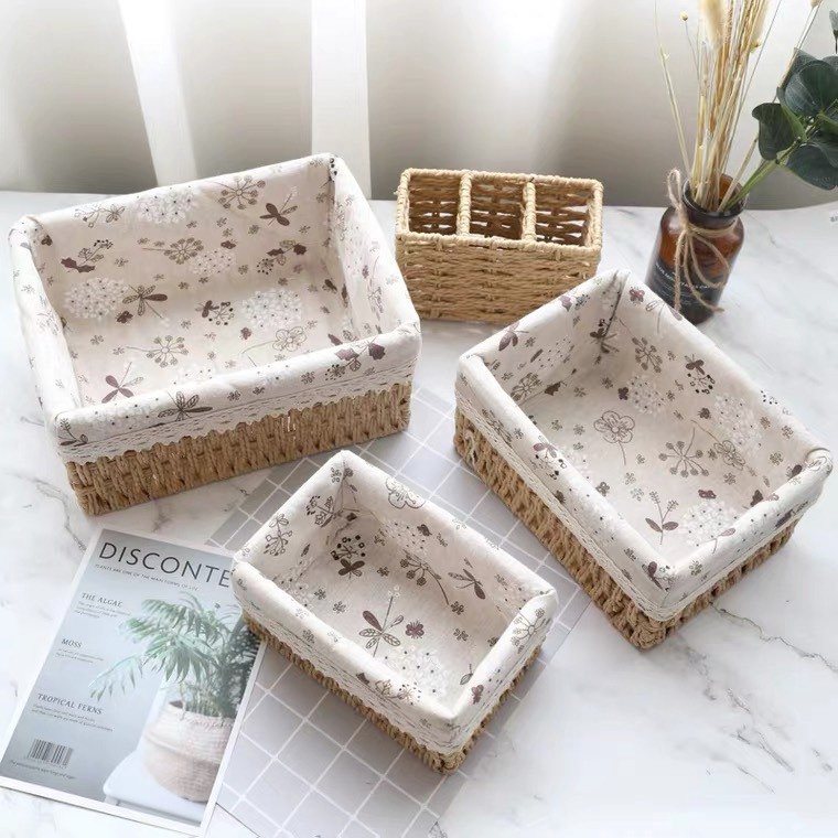 🌈Giỏ cói đựng đồ vintage có vải lót hình chữ nhật trang trí nhà cửa (Rổ cói lót vải)[CÓ SẴN ĐỦ SIZE]