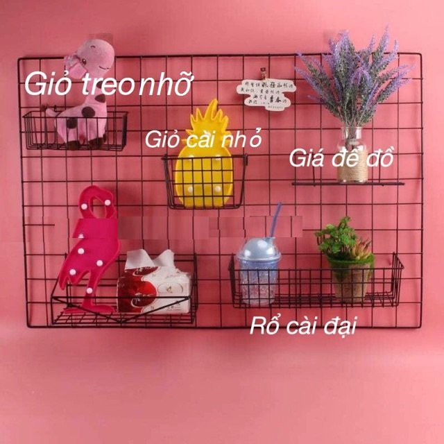 Khung lưới sắt trang trí treo tường, decor, giỏ lưới, rổ cài đại ,giỏ cài nhỡ, thanh để đồ, kẹp gỗ, kẹp ảnh, dây cờ