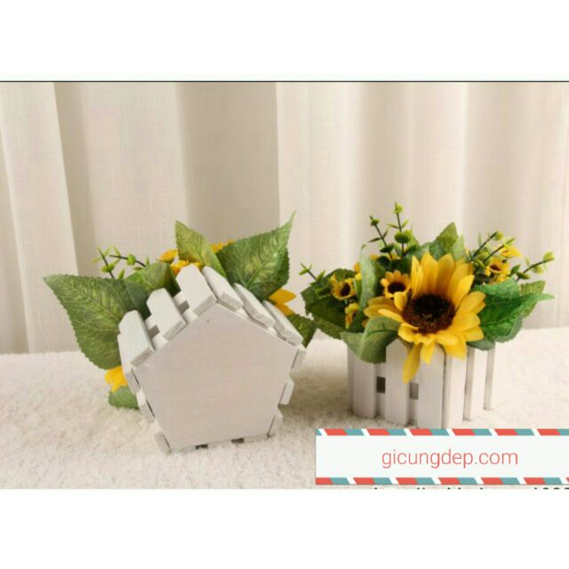 Sản phẩm thích hợp trang trí cho không gian bừng sáng.Chất liệu: hoa vải lụa, nhựa, hàng rào gỗ