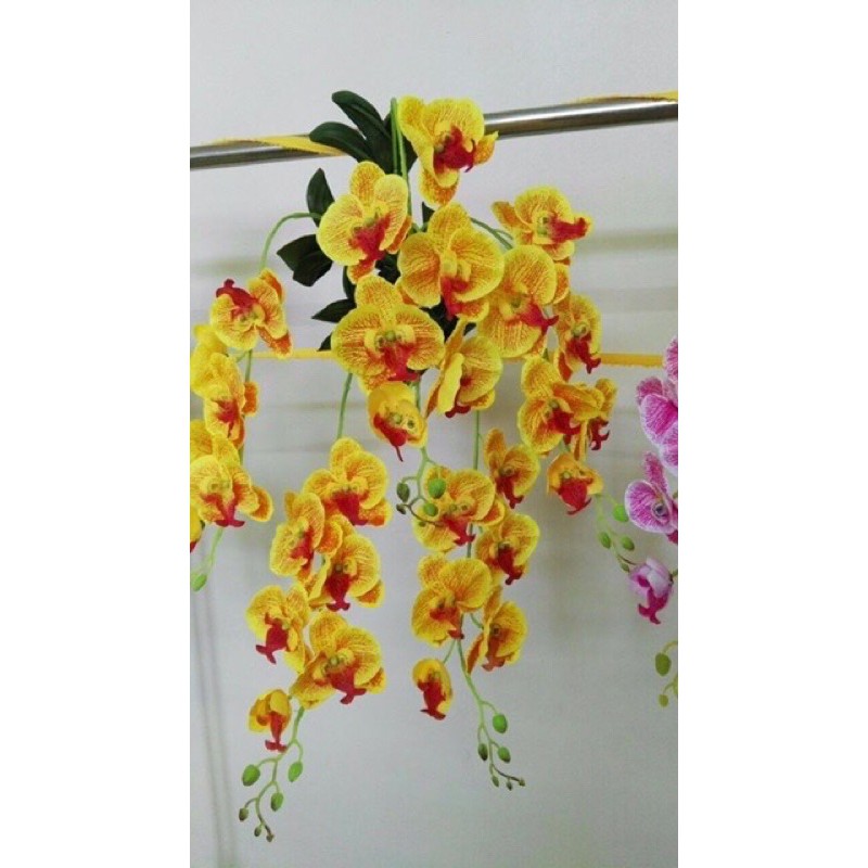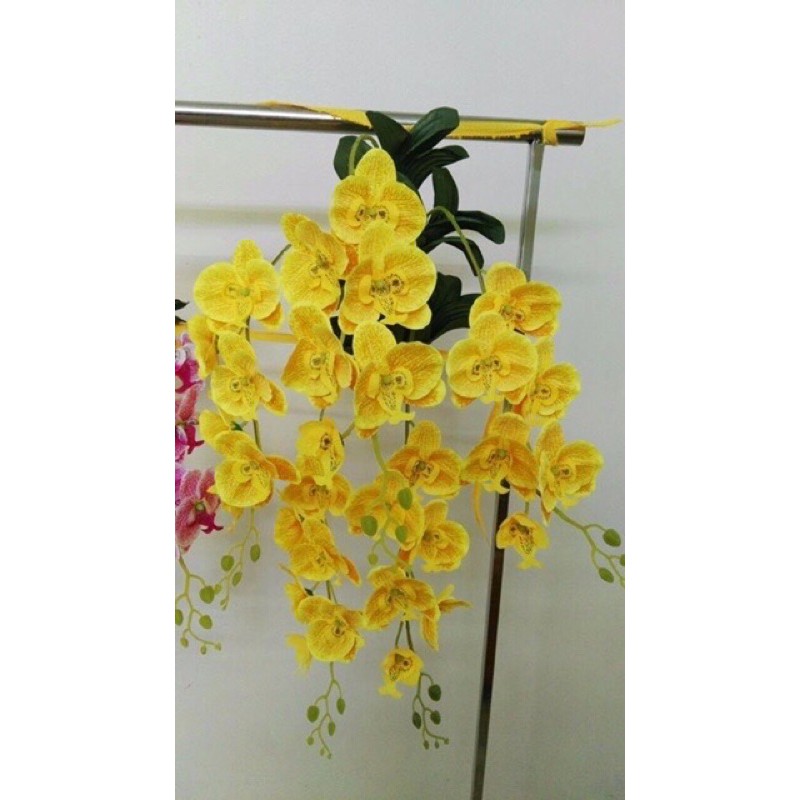 Giò hoa lan hồ điệp treo tường, góc tường đóng sẵn chỉ việc treo lên thôi ạ, thích hợp treo phòng khách, nhà hàng, quán cafe,....- 1 giò bao gồm đầy đủ 5 nhánh, lá, giò gỗ, lá lan xốp móc treo việc của bạn chỉ cần uốn cành rủ xuống theo ý muốn và treo lên thôi ạ