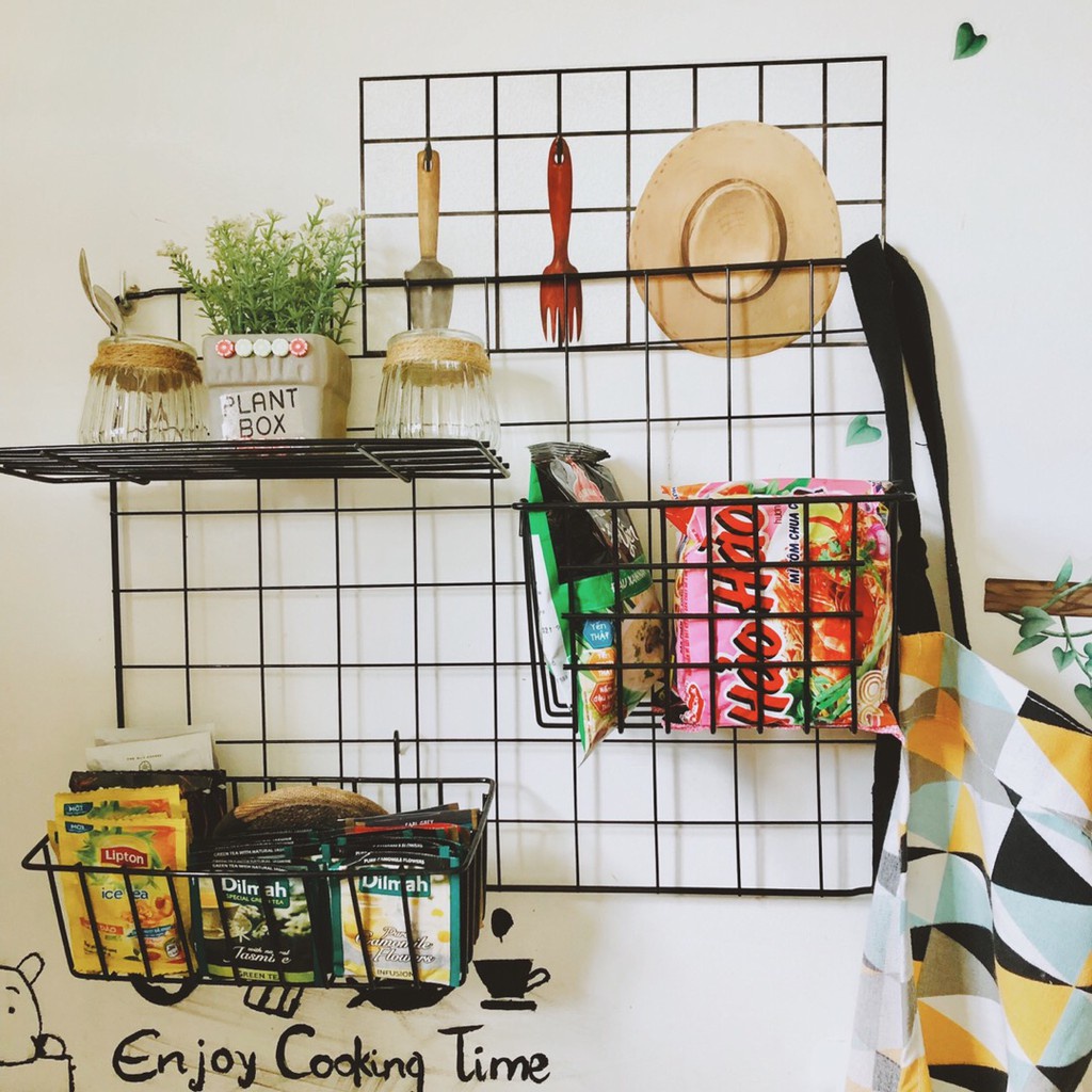 - Một cách sáng tạo khác là dùng khung lưới để treo đồ nhà bếp hoặc treo chậu cây cảnh nhỏ, tạo nên một mảng tường xanh cho không gian sống của bạn.