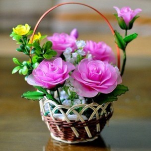 Giỏ mây nhí cắm hoa giấy, hoa đất sét