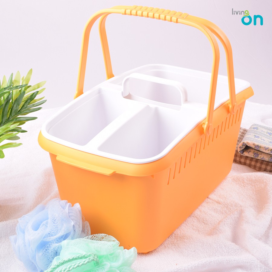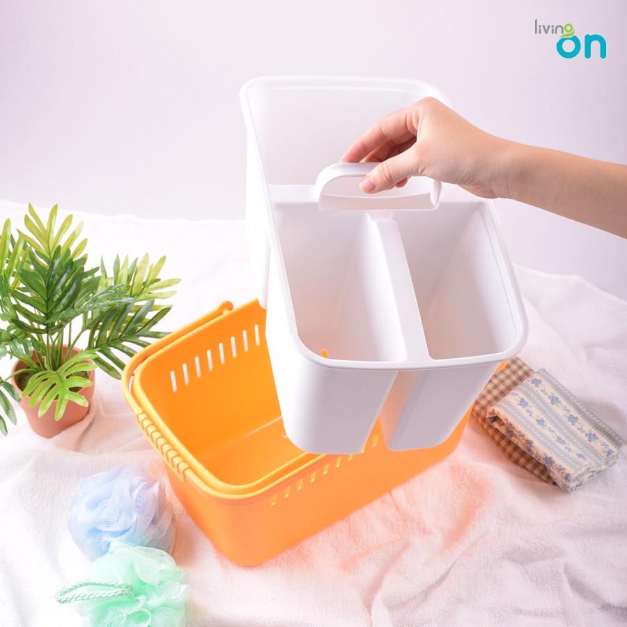 Thiết kế 2 trong 1: bên trong là giỏ màu trắng gồm 3 ngăn, bên ngoài là giỏ màu cam