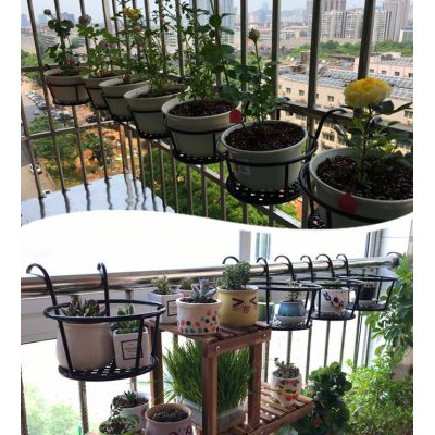 - Khung sắt treo lan can được làm từ sắt sơn thếp màu đen, chắc chắn, thiết kế thông minh để gắn lên can can ban công, cửa sổ, giàn treo.