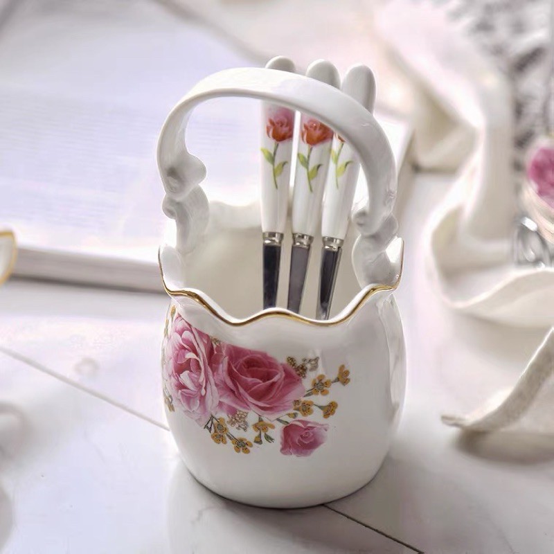 🍀 Sản phẩm: Giỏ đựng thìa dĩa bằng sứ in hoa viền kim