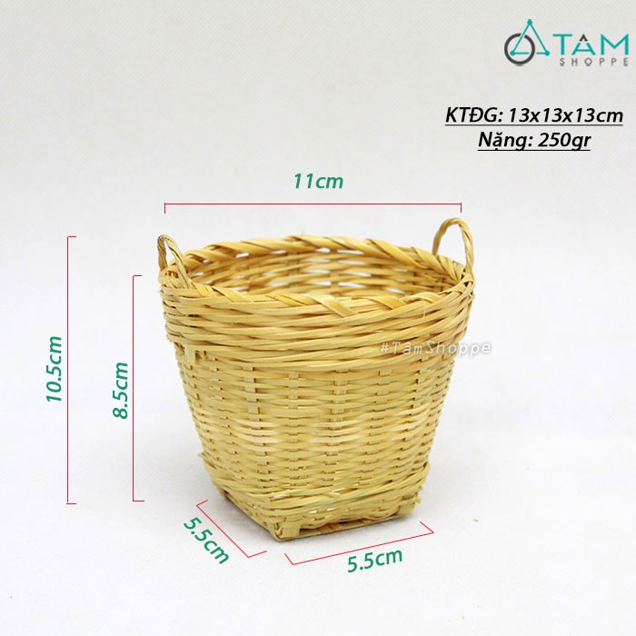 Giỏ tre mini cần xé hai quai cầm trang trí xinh xắn. Khi nhắc đến Tết cổ truyền, trong tiềm thức của mỗi con người sẽ gợi nhớ đến hình ảnh gia đình đang quây quần bên nhau dưới mái nhà tranh vách nứa mộc mạc. Những vật dụng làm bằng mây tre nứa như mẹt, thúng, quang gánh… là những hình ảnh quen thuộc với đời sống sinh hoạt thường ngày của người dân Việt Nam xưa…CHI TIẾT SẢN PHẨM: