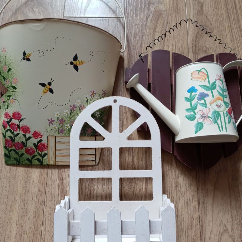 - Giỏ bình tưới gắn giá gỗ trái tim: bình thiếc giá gỗ, kích thước: giá gỗ 21x24cm, bình thiếc cao 12cm, miệng 4x7cm.