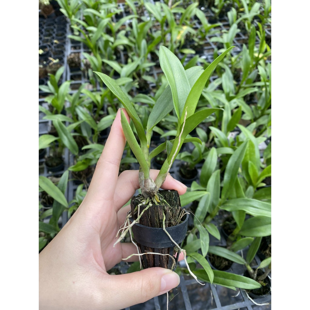 Cây hoa lan giống Dendrobium, cây ra vườn được 04 tháng, trồng bằng giá thể xơ dừa đã xử lý.