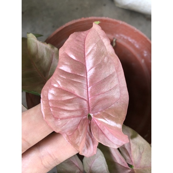 • Cây thuộc họ thân mềm, lá gần như lá môn, có màu hồng sáng.