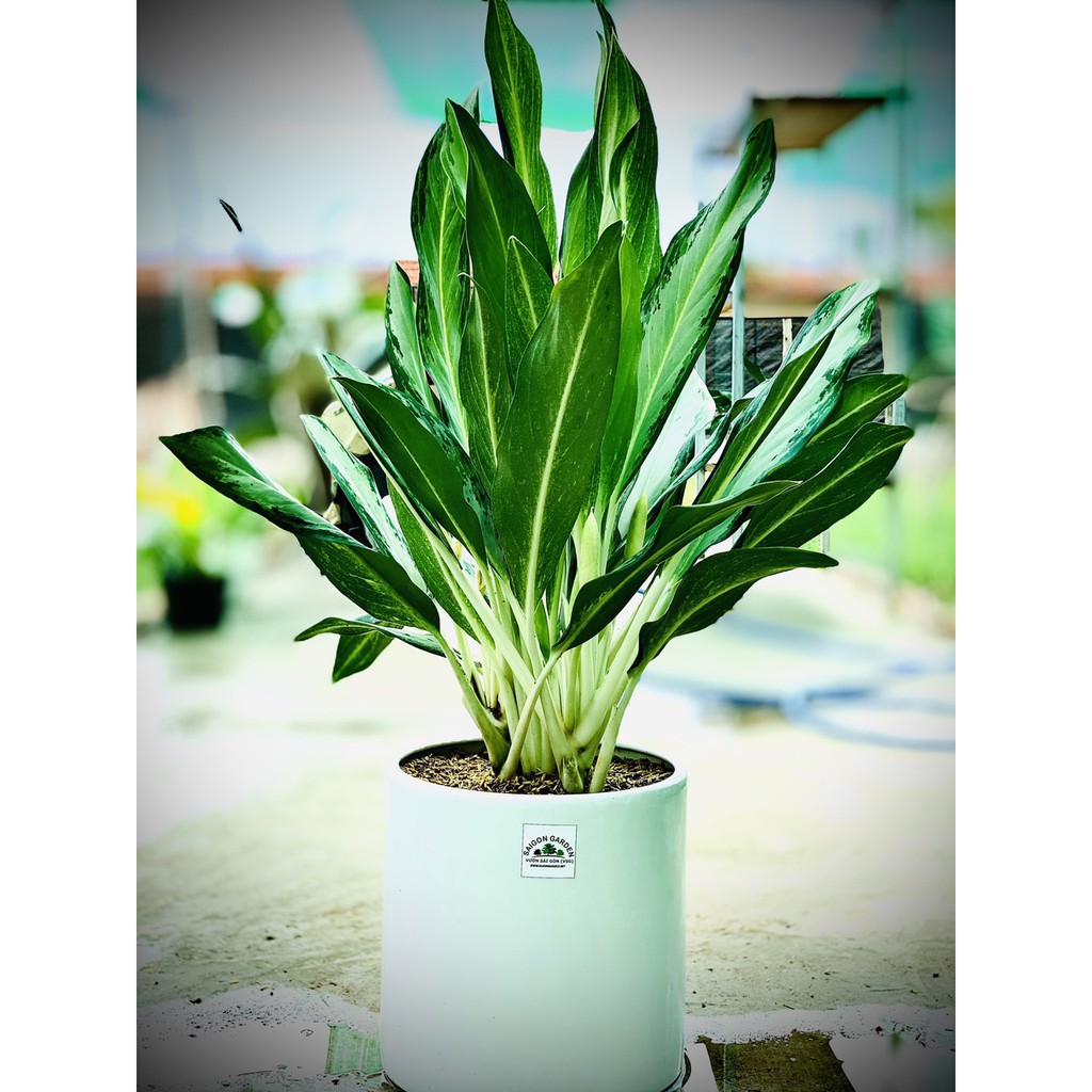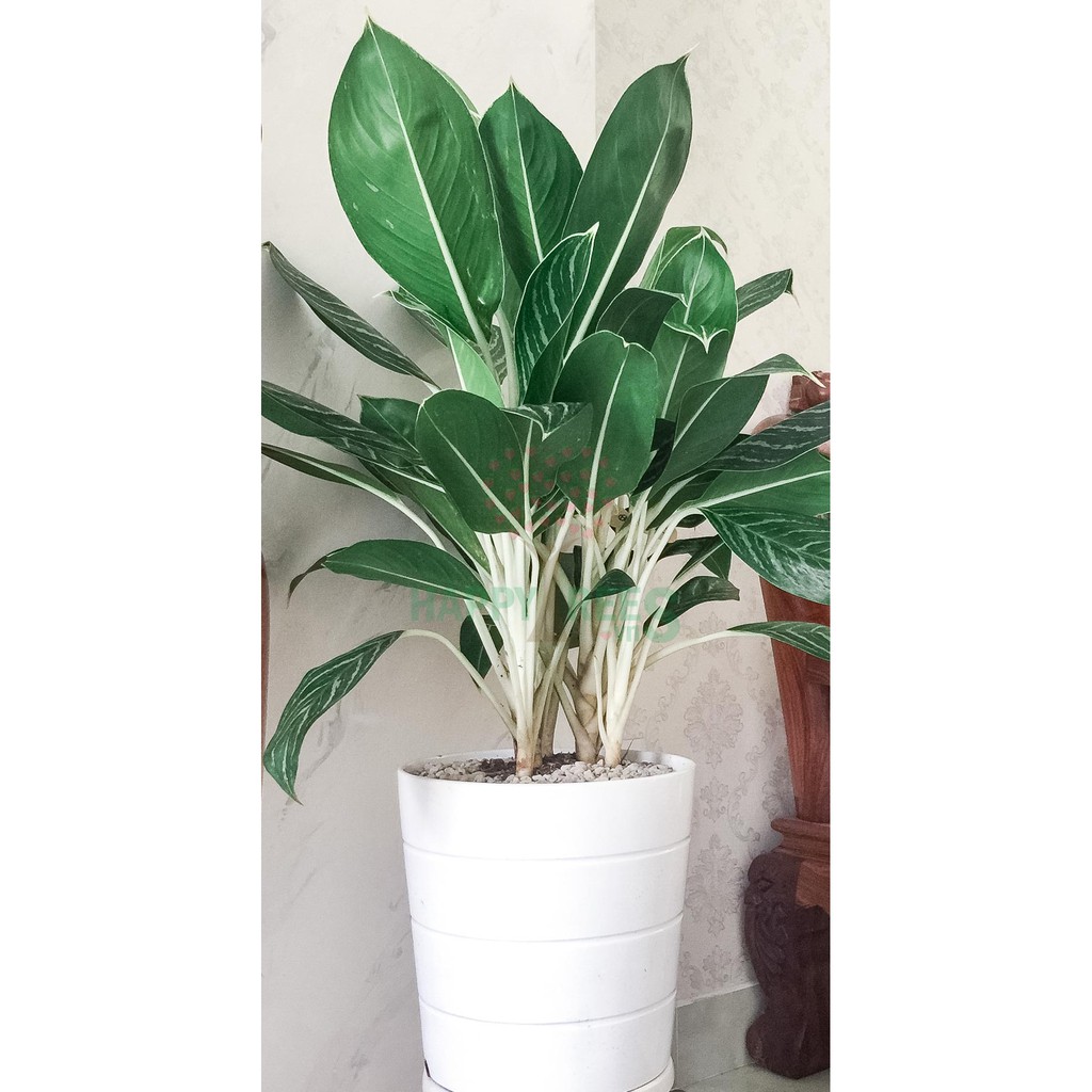 Lá của cây phân 2 kiểu hình, một loại kích thước rộng hơn, loại còn lại thon dài và hẹp. Nhọn hai đầu, cuống dạng bẹ ôm lấy thân. Trên lá thường có màu xanh vành mép hoặc xanh ngọc, màu trắng hồng ở giữa không đều, cây ít thấy ra hoa, hoa dạng mo màu trắng mọc trên nách lá.