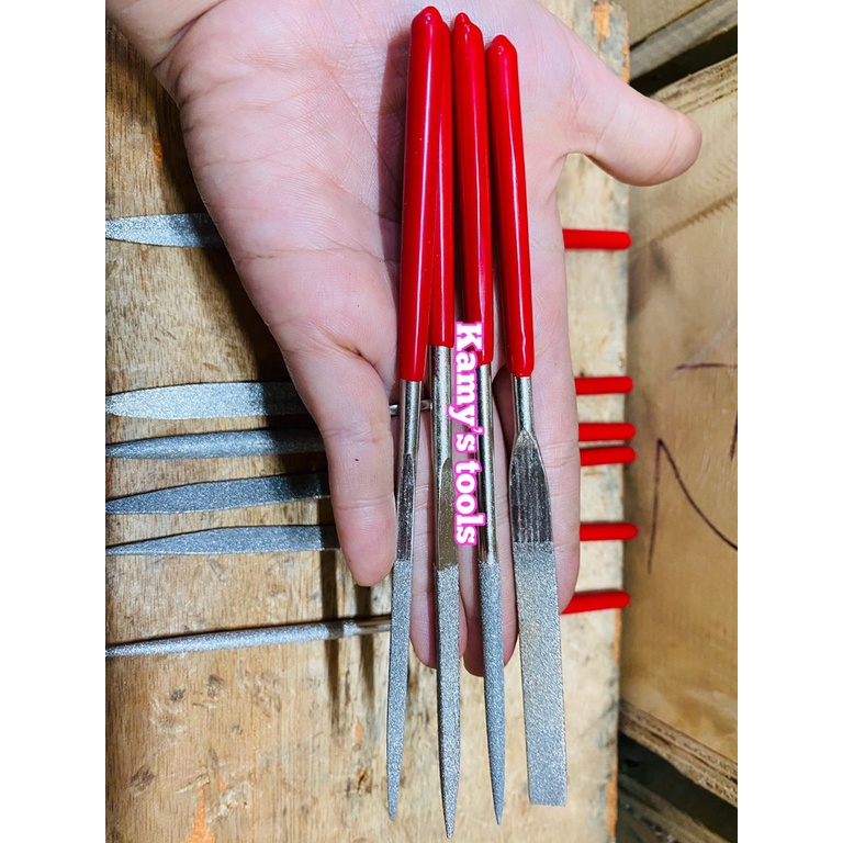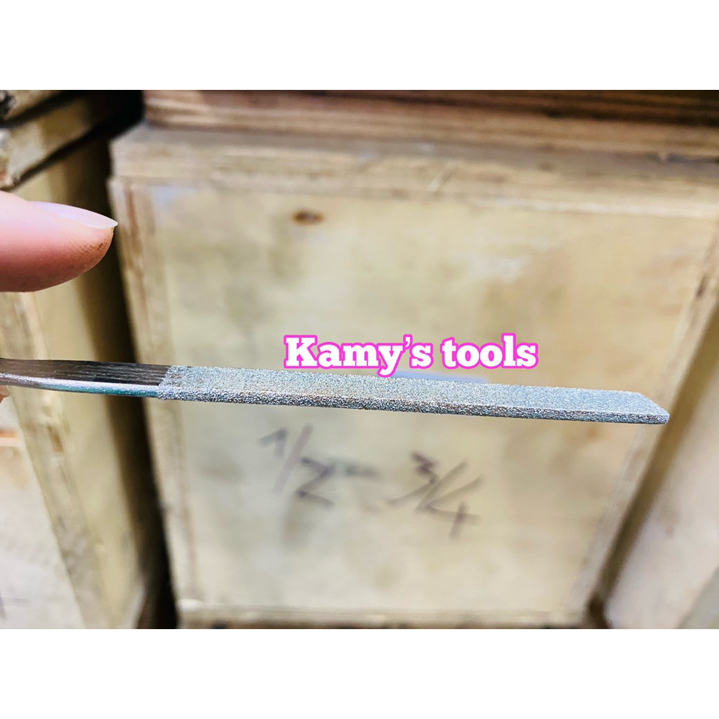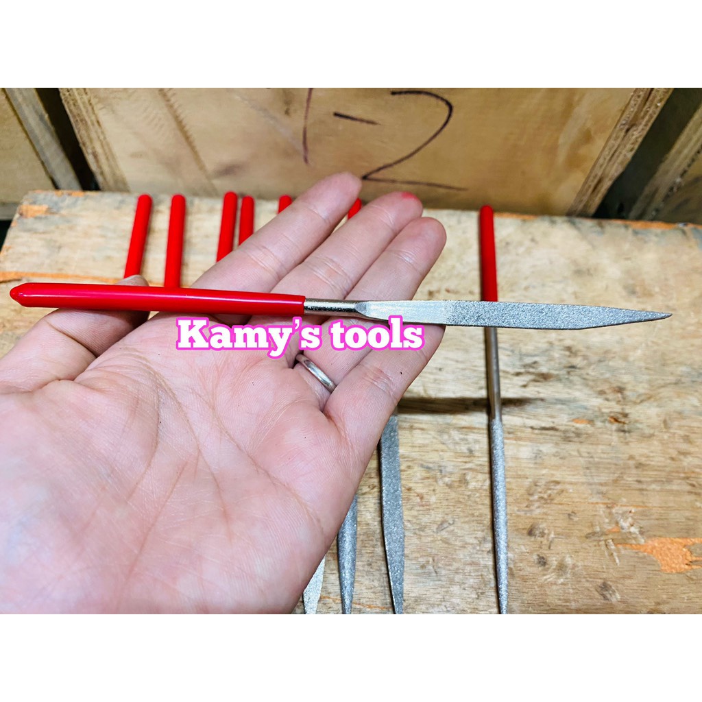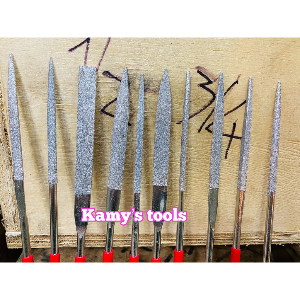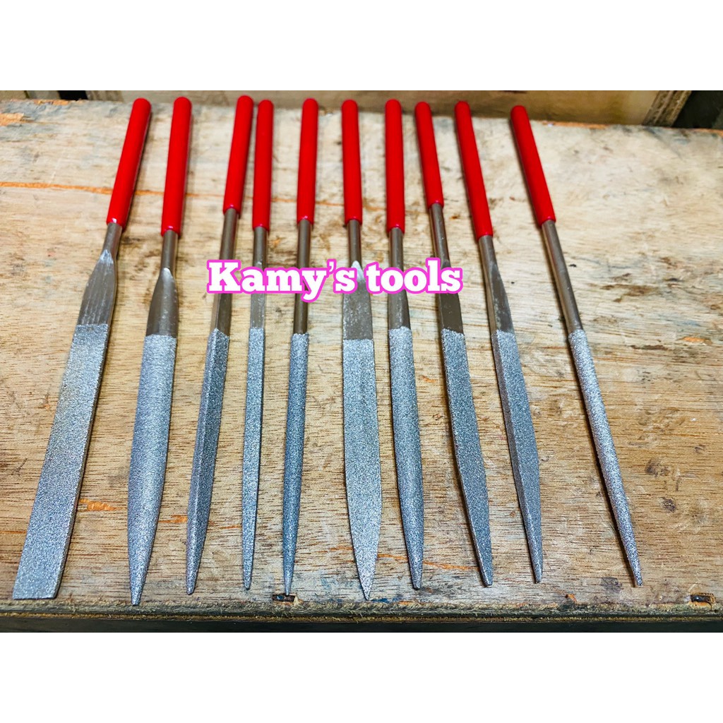 Kamy's tools chuyên phân phối Bộ giũa mài kim loại đa năng 10 cây có hợp kim hiệu Diamond Files có kích thước : 180x5mm là bộ gồm 10 cây giũa với nhiều hình dáng khác nhau như; tròn, tam giác, dẹp, lòng mo( bán nguyệt) và các hình dáng biến tấu khác nhàu hỗ trợ tối đa cho người dùng khi giũa các góc cạnh của chi tiết máy. Loại có hợp kim có thể dũa được các chất liệu cứng như : thép, inox và các kim loại thông thường như sắt, nhôm, đồng..... Bộ giũa có kích thước nhỏ, gọn, phù hợp để giũa các chi tiết nhỏ , hoặc các chi tiết nằm trong các góc kẹt mà giũa lớn khó thao tác.Tương tự , bộ giũa mini 10 cây hiệu Hugong không hợp kim cũng bao gồm 10 cây giũa có kích thước 180x5mm. Loại này thì giũa được các kim loại thông thường như : sắt, nhôm, đồng.... Vì vậy mà giá thành của nó rẻ hơn. Quý khách có thể cân nhắc để chọn bộ phù hợp.