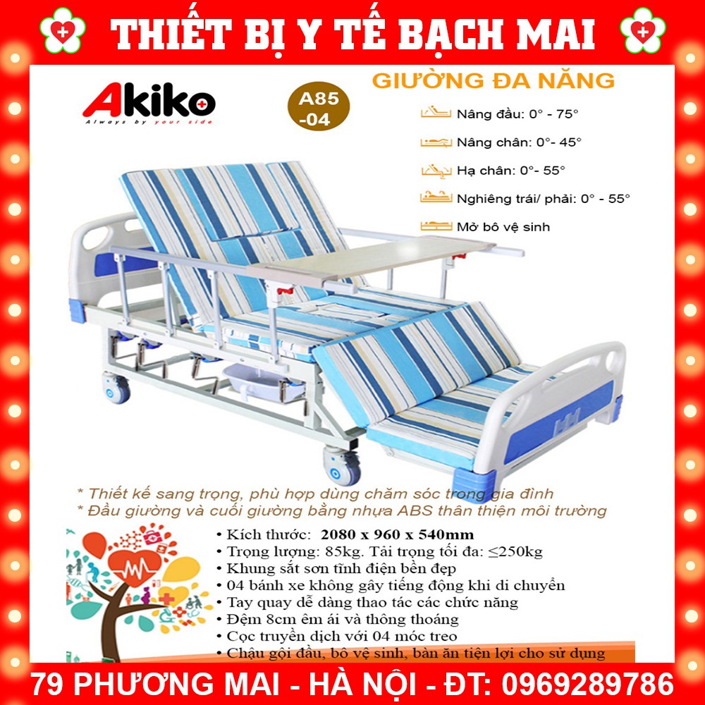 Giường bệnh nhân y tế 4 tay quay Akiko A85 là sản phẩm giường cao cấp của Akiko có đệm, bô vệ sinh, chậu gội đầu, bàn ăn, cọc truyền dịch