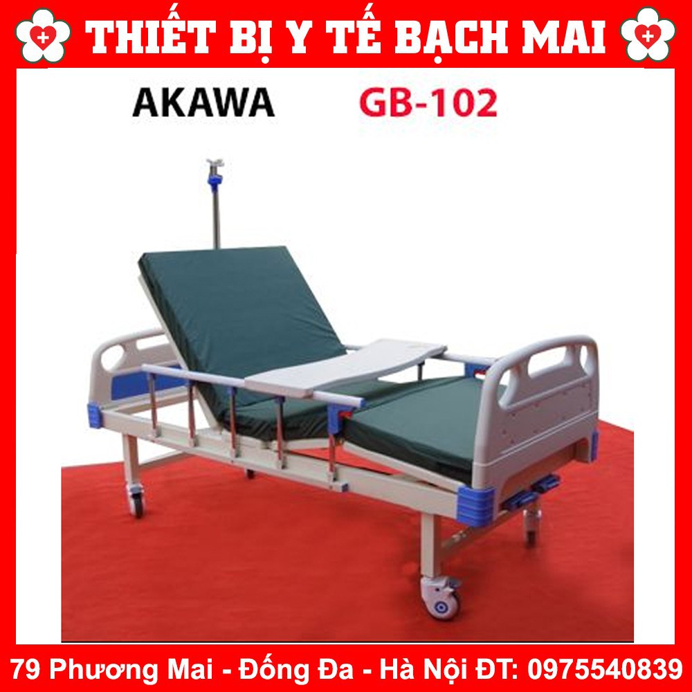 Trọn bộ giường Akawa GB-102 gồm: Giường, đệm, lan can, cọc truyền dịch, bàn ăn, 2 tay quay