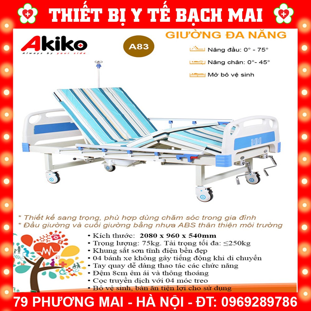 - Giường bệnh nhân 3 tay quay Akiko A83 thiết kế chuyên sử dụng chăm sóc người bệnh, người cao tuổi già yếu. Với những tính năng nâng cao đầu, nâng hạ chân, bô vệ sinh hỗ trợ rất nhiều cho bệnh nhân trong quá trình hồi phục sức khỏe. Giường bệnh nhân 3 tay quay Akiko A83 thường được trang bị ở bệnh viện, phòng khám và ngay trong gia đình có bệnh nhân nặng nằm điều trị tại nhà.