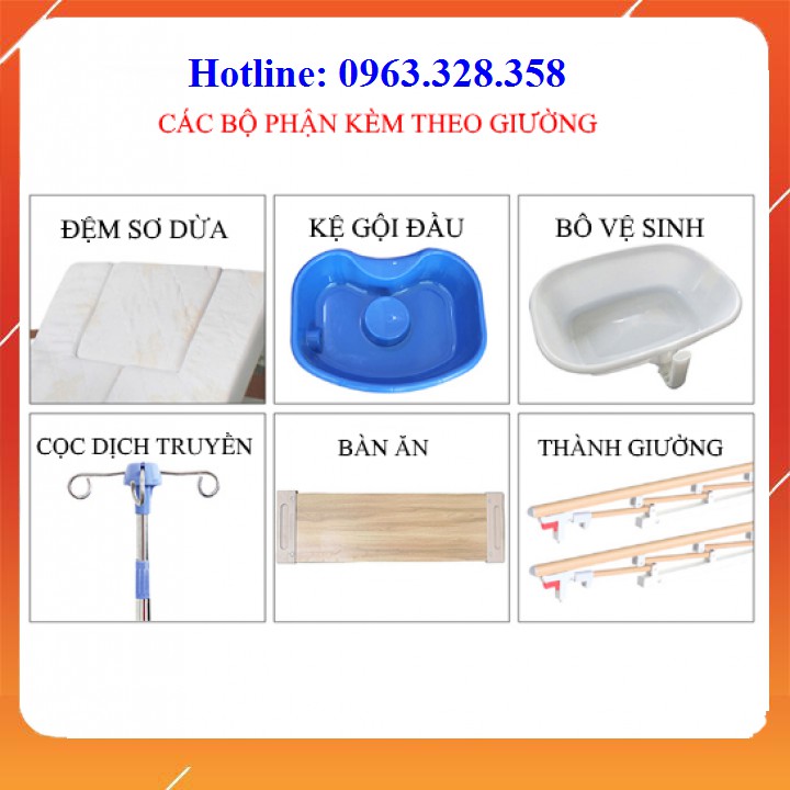 Nguyên bộ: cây truyền, bàn ăn, đệm, bô vệ sinh, chậu gội đầu, tay dự phòng khi mất điện