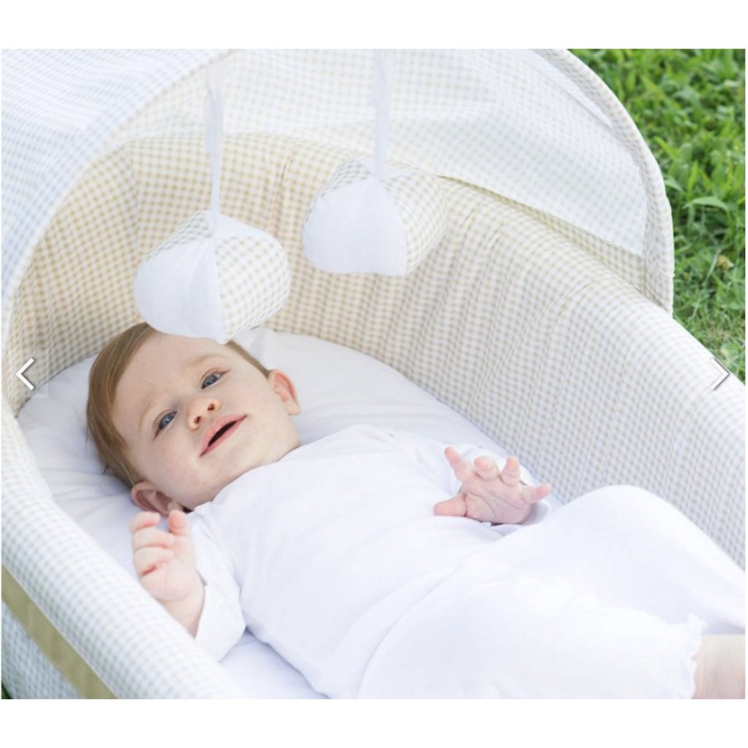 🔹 Bao gồm: Bộ sản phẩm bao gồm 1 giường ( Nôi ), mái che, màn lưới, bộ 3 xúc xắc đồ chơi treo, tấm đệm êm.