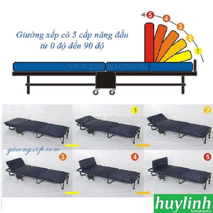 - Khung giường: làm bằng thép sơn tĩnh điện bền & chắc chắn, nối với nhau bằng bản lề có thể gấp gọn sau khi sử dụng.