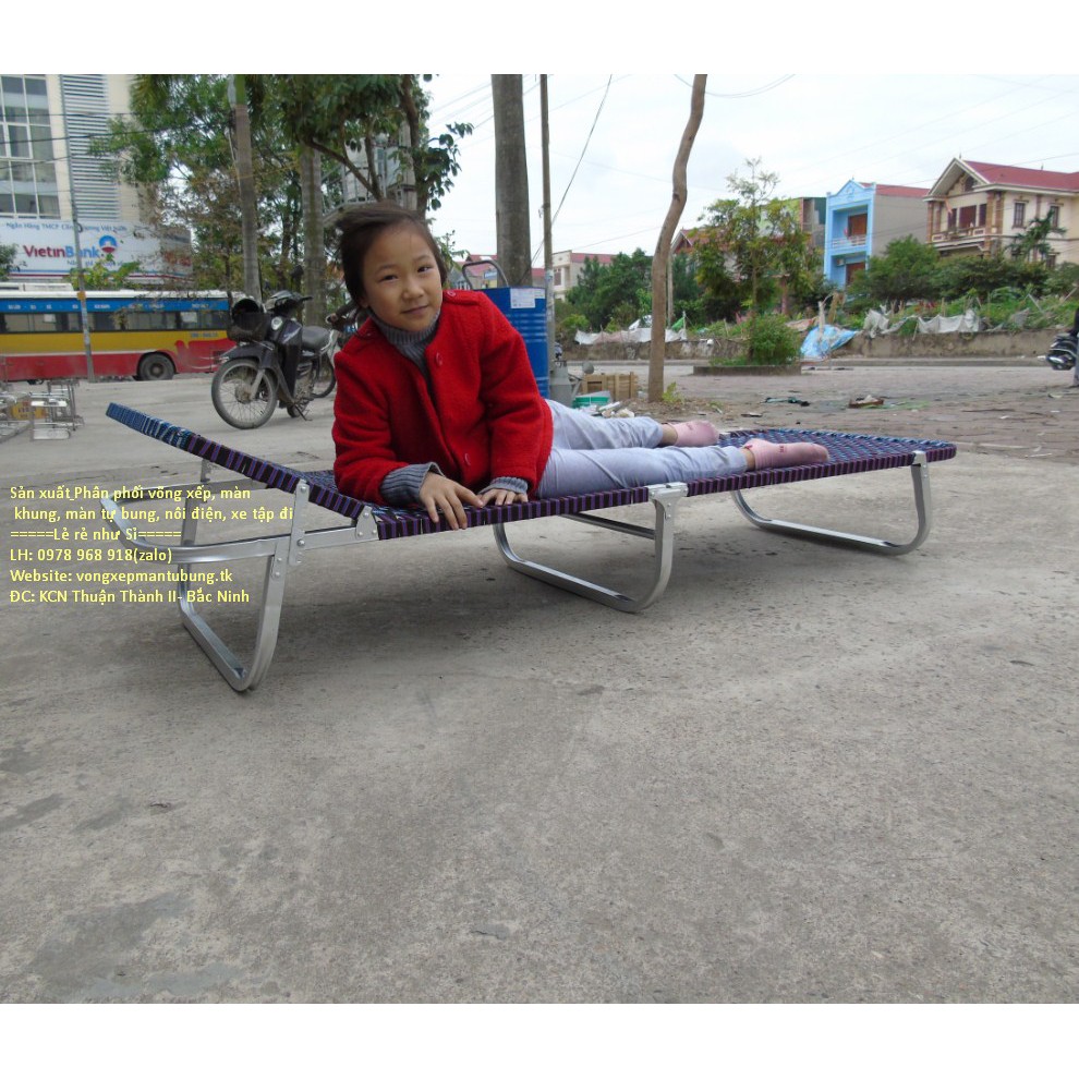 Vật liệu: Giường gấp, giường xếp có khung được làm bằng nhôm vuông, sơn nhũ, dây đai là sợi tổng hợp 20mm.