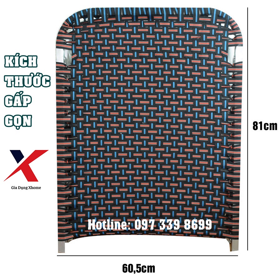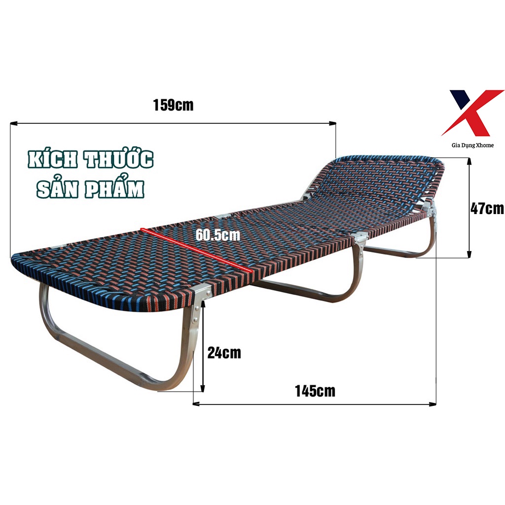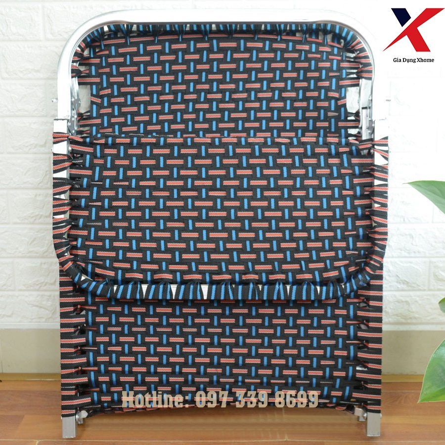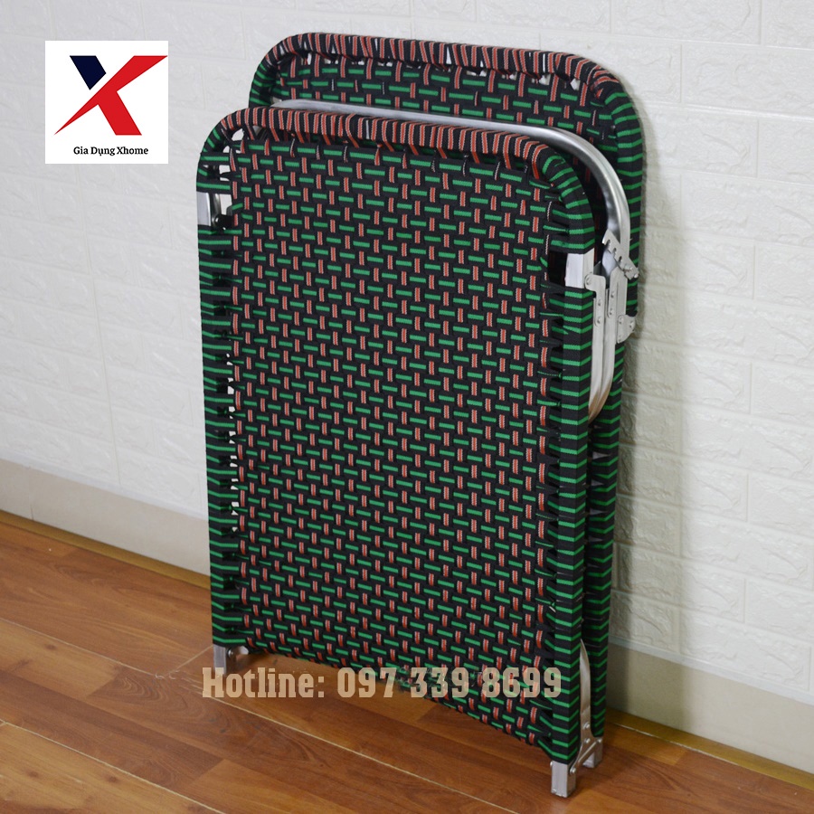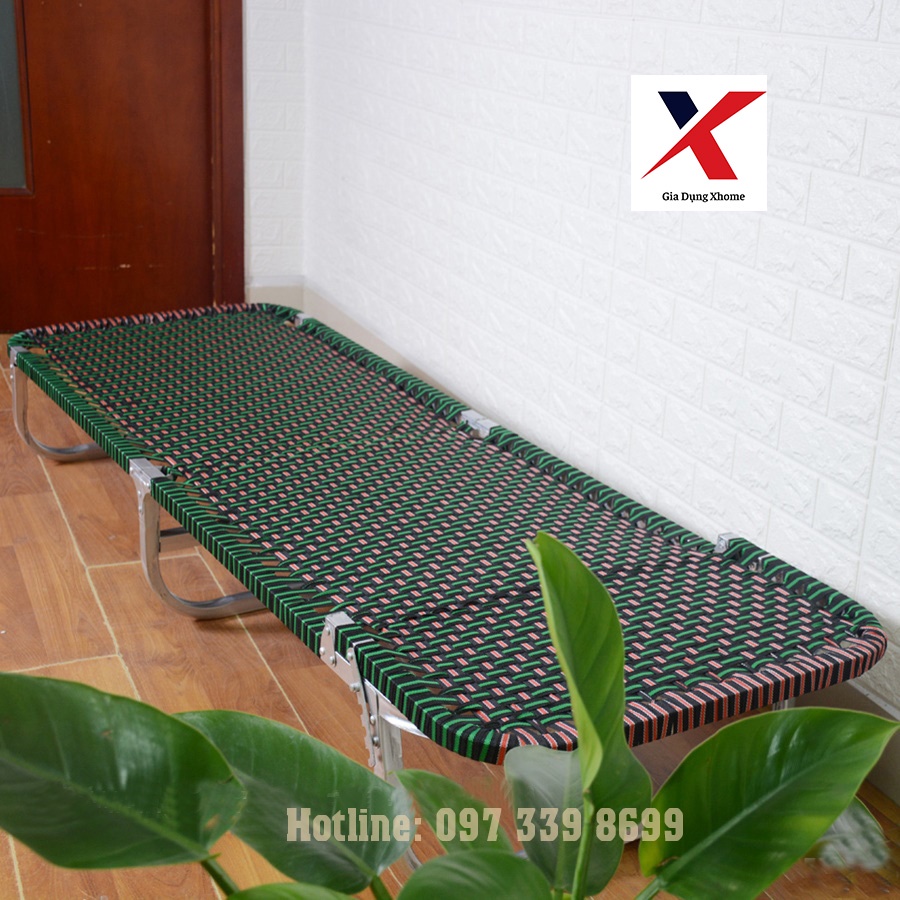 Vật liệu: Giường gấp, giường xếp có khung được làm bằng nhôm vuông, sơn nhũ, dây đai là sợi tổng hợp 20mm.