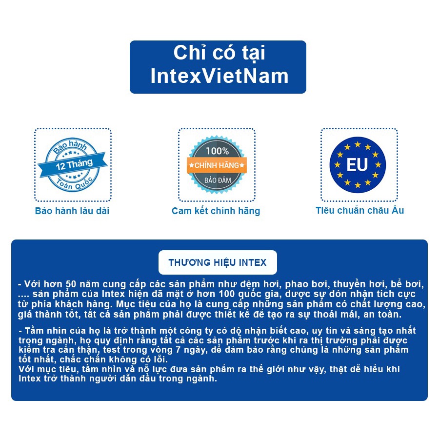 Đây là gian hàng chính thức của Intex Việt Nam, đơn vị phân phối độc quyền của thương hiệu Intex tại Việt Nam, có đầy đủ giấy tờ và chính sách sản phẩm chính hãng cho khách hàng. Vì trên thị trường có rất nhiều hàng giả, hàng nhái nên khách hàng cần tìm hiểu kĩ, vì đây là sản phẩm đồ hơi, nếu không phải hàng chính hãng thì sẽ rất nhanh bục và xì hơi.-----------------