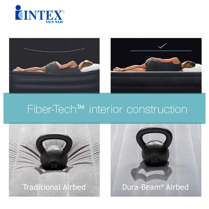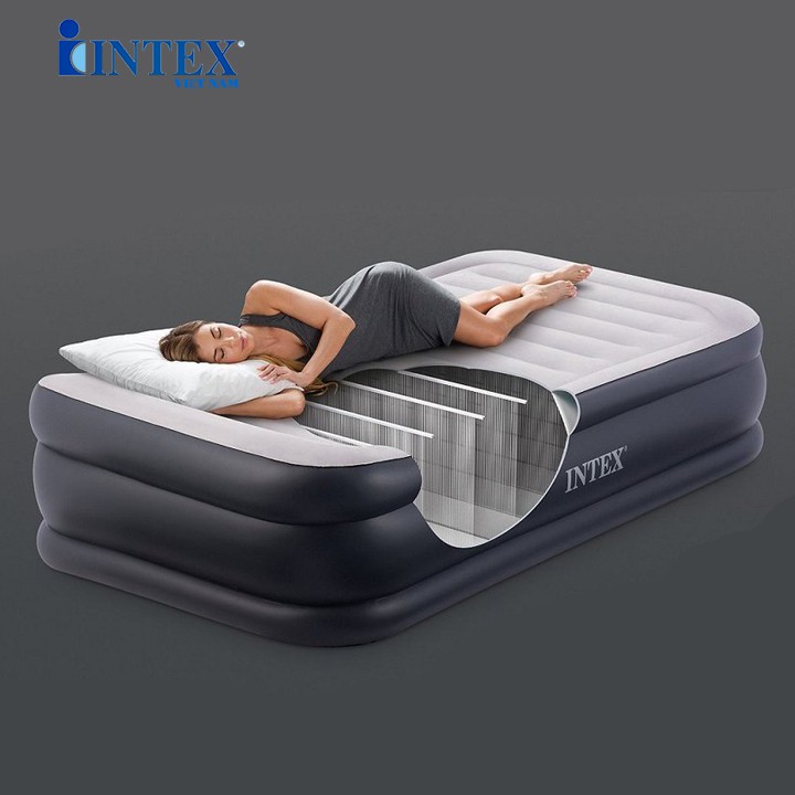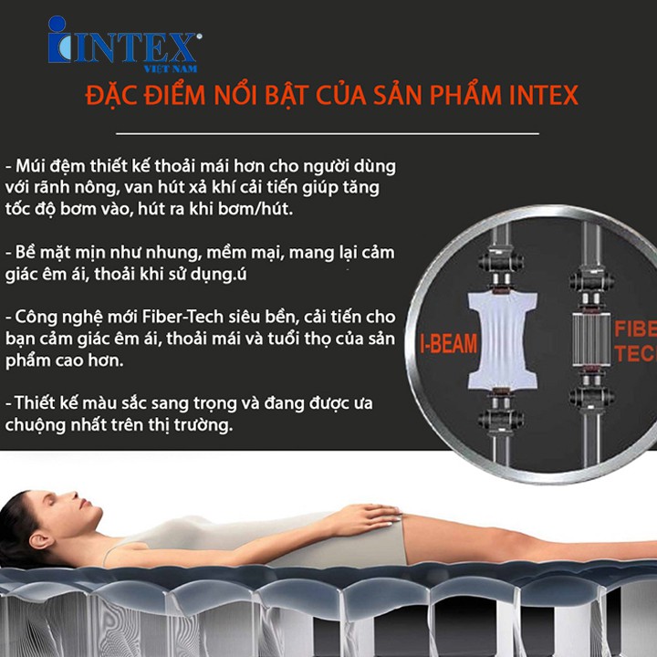 - Tiện dụng, giá thành thấp, nằm êm ái, dễ chịu, tốt cho cột sống, mát về mùa hè, ấm về mùa đông mà vẫn không bị bí hơi bởi các múi khí thông minh, dễ dàng bơm và xả cất đi chỉ trong 1 phút; dễ dàng giặt, rửa, lau chùi khi bẩn, không bị thấm nước vào lòng trong, không bị nóng và bí vào mùa hè đệm như đệm mút hoặc đệm bông ép thông thường; có thể gập nhỏ, gọn trong valy hoặc tủ khi không dùng đến. Khi dùng đệm hơi, giường hơi INTEX, bạn tiết kiệm được chi phí mua giường, mua ga, mua chiếu và những phụ kiện không cần thiết, ngoài ra còn rất bảo vệ môi trường, do vậy đệm hơi INTEX là sản phẩm tiên tiến và được ưa chuộng số 1 tại các nước phương Tây.
