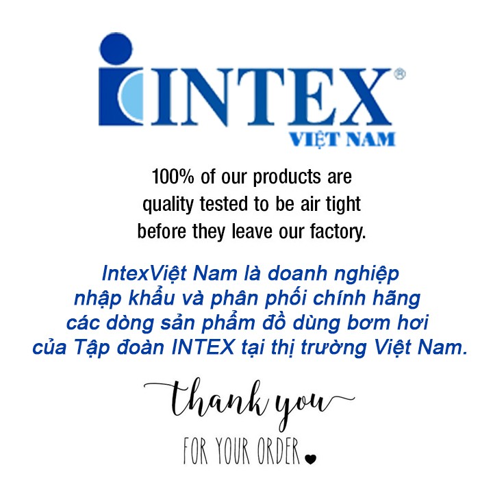 "Đây là gian hàng chính hãng các sp INTEX phân phối bởi INTEX VIỆT NAM. 100% sản phẩm đã được kiểm tra hơi 3-5 ngày, đảm bảo không xì thủng trước khi đóng hộp xuất khẩu. Các sản phẩm bán qua sàn TMDT sẽ chỉ áp dụng chế độ bảo hành sửa chữa nếu có bằng chứng chứng minh được lỗi từ nhà sản xuất. Do đặc thù của sản phẩm bơm hơi, đề nghị quý khách hàng dùng điện thoại quay video sản phẩm (không cắt ghép) từ khi mở hộp nhận hàng đến khi bơm hàng lên để chứng minh lỗi từ nhà sản xuất (nếu có). Công ty chỉ đổi hàng theo chính sách đổi hàng của các sàn TMDT khi có video chứng minh lỗi từ nhà sản xuất từ khi mở hộp✪ Hãng sản xuất: INTEX