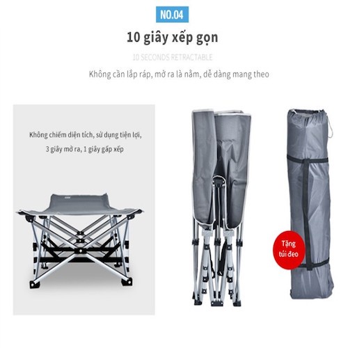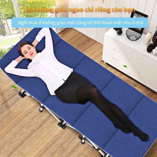 - Kích thước giường: 190cm * 67cm * 35cm - Kích thước xếp gọn: 100cm * 27cm * 17cm - Trọng lượng: 7kg - Khả năng chiệu tải: Tối đa 200kg - Chất liệu: Thép không gỉ, nhôm cao cấp. vải thấm hút siêu bền, tạo cảm giác êm ái. - Mẫu thiết kế phục vụ cho nhu cầu nghỉ ngơi giữa buổi của mọi người đặt biệt là dân văn phòng hoặc xếp gọn khi đi du lịch picnic cũng là một ý tưởng hay. - Ưu điểm: dễ dùng, thao tác nhanh gọn - dùng mọi địa hình (nhiều chân ) - khung có kết cấu dàn không gian - chắc chắn - Phù hợp với nhà ở có không gian hẹp hay sử dụng trong khách sạn, bệnh viện... dùng làm giường dự phòng. - có thể xếp gọn không chiếm nhiều không gian