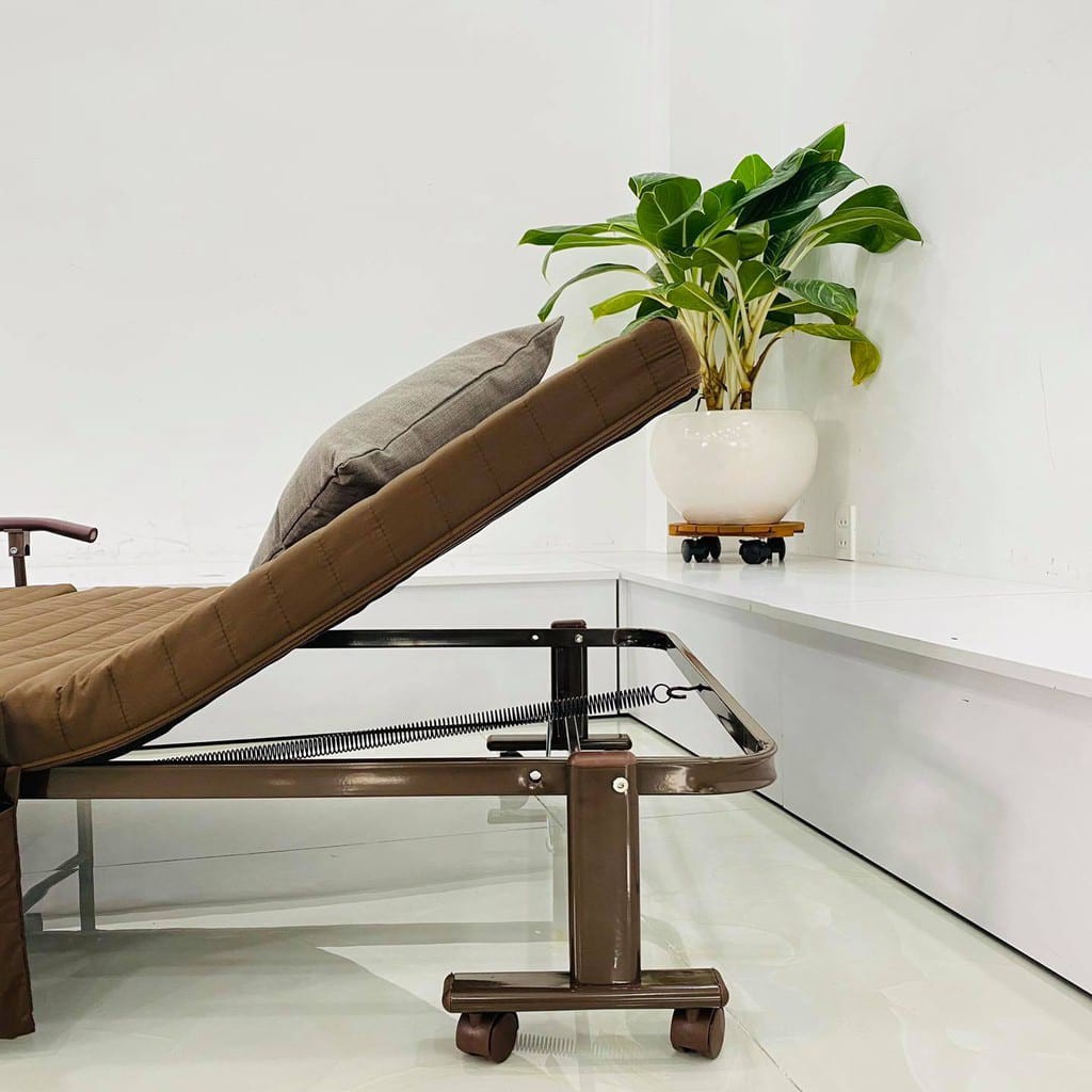 - Chân giường có bánh xe giúp di chuyển dễ dàng hoặc gấp gọn khi không sử dụng.
