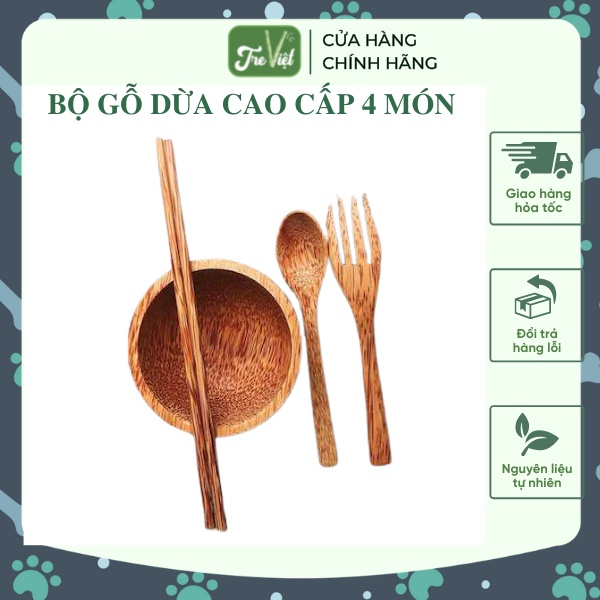 Bộ gỗ dừa cao cấp - Chén gỗ dừa + Muỗng nĩa đũa