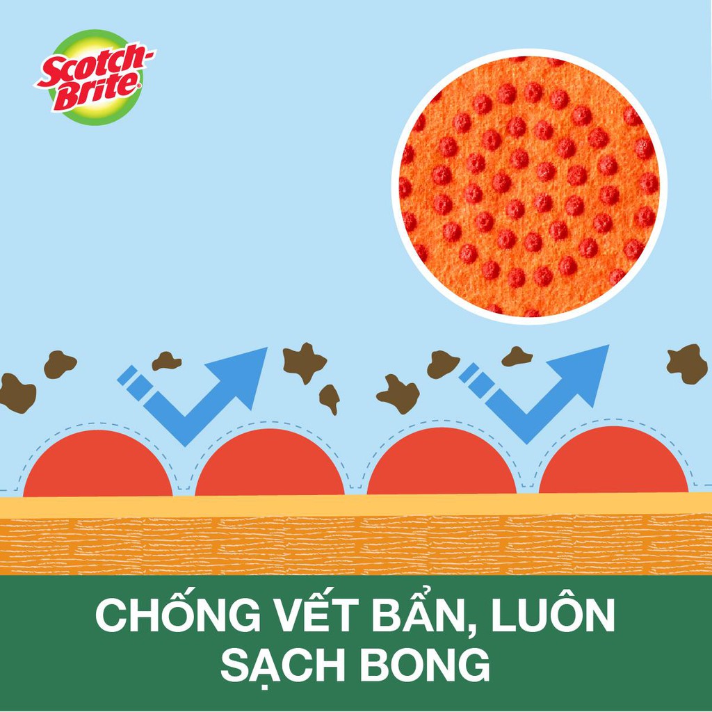 Rửa sạch vết bẩn – lớp phủ đặc biệt trên bề mặt giúp loại bỏ các cặn bẩn bám dính và chống lại mùi khó chịu một cách hiệu quả.Chà mạnh mẽ - lớp phủ hạt nổi trên bề mặt miếng rửa chén gúp làm sạch các vết bẩn cứng đầu.