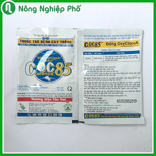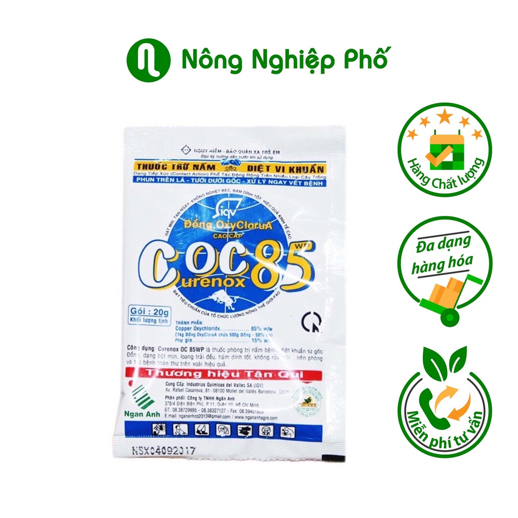 Thuốc trừ bệnh cây trồng - COC85 Gói 20 gramMô tả ngắn: Sản phẩm thuốc trừ bệnh trên cây trồng COC 85 được sản xuất từ ion gốc Đồng (Cu2+), dạng bột mịn, loang đều và bám dính tốt. Sản phẩm được dùng để phòng trừ nấm bệnh, rỉ sắt, đóm đen trên các loại cây trồng, cây kiểng. Đặc biệt là hoa hồng, cây mai, đào.