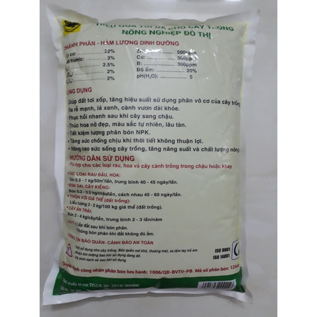 Công dụng: Giúp đất tơi xốp, tăng hiệu quả sử dụng phân vô cơ của cây trồng. Ra rễ mạnh, lá xanh, cành vươn dài khoẻ . Phục hồi nhanh sau khi cây sang chậu. Thúc hoa nở đẹp, màu sắc tự nhiên, lâu tàn. Tiết kiệm lượng phân bón NPK. Tăng sức chống chịu khi thời tiết không thuận lợi. Nâng cao sức sống cây trồng, tăng năng suất và chất lượng nông sản. Phù hợp cho các loại rau, hoa và cây cảnh trồng trong chậu hoặc khay.