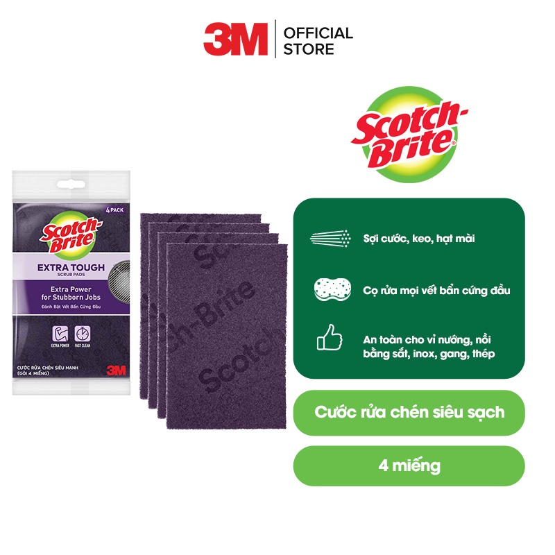 Nhà cửa & Đời sống > Dụng cụ chăm sóc nhà cửa > Miếng bọt biển, miếng chà vệ sinh || [Gói 4 miếng] Cước Rửa Chén Siêu Mạnh Scotch Brite - Cọ rửa mọi vết bẩn cứng đầu, an toàn cho vỉ nướng, nồi inox, gangCòn hàng