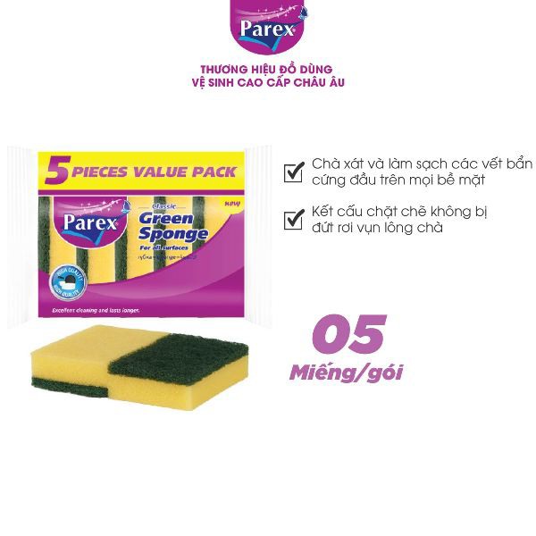 Nhà cửa & Đời sống > Dụng cụ chăm sóc nhà cửa > Miếng bọt biển, miếng chà vệ sinh || Gói 5 miếng rửa chén cao cấp Parex 2 mặt bọt biển và cước xanh nhámCòn hàng